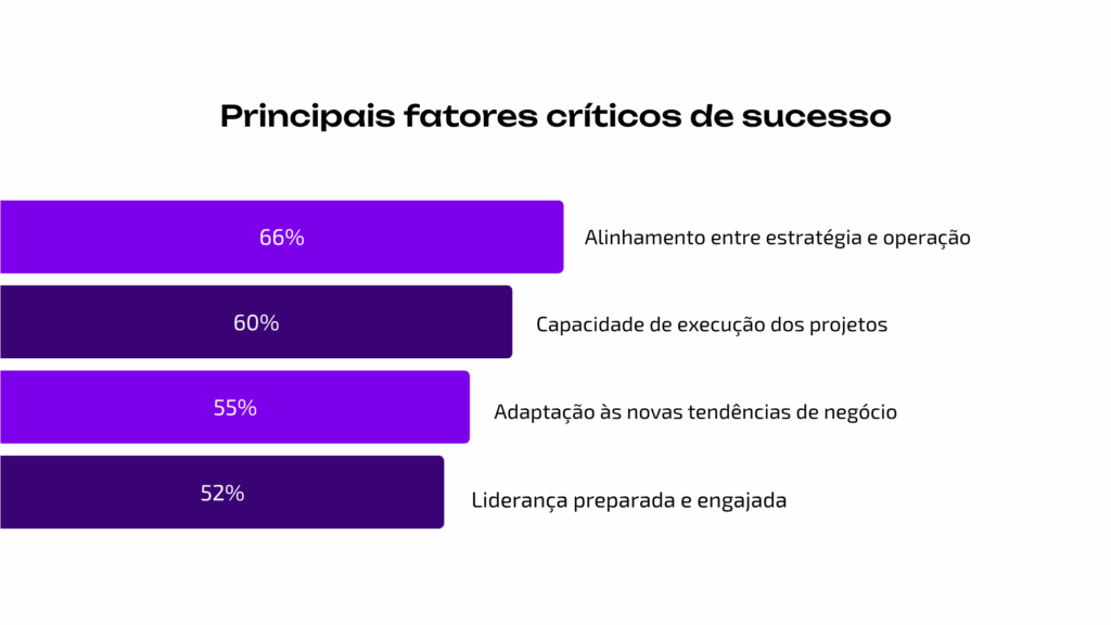 Para transformar expectativas em resultados, as empresas destacam fatores críticos como o alinhamento entre estratégia e operação disparou nas respostas com 66% de importância para os empresários. O segundo e terceiro fator ficaram com: capacidade de execução dos projetos (60%) e a adaptação às novas tendências de negócio (55%).